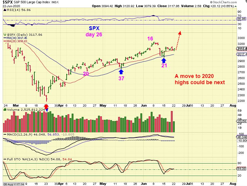 OUR WEEKEND SPX WEEKLY CHART SAID: Plain and simple: This is a bullish chart set up with a reversal off of the 10 week ma. We just had a quick ‘crash’ into a 1/2 cycle low and are in the 2nd half of the 2nd daily cycle, so I would expect this to run to the prior highs. Maybe 3400?