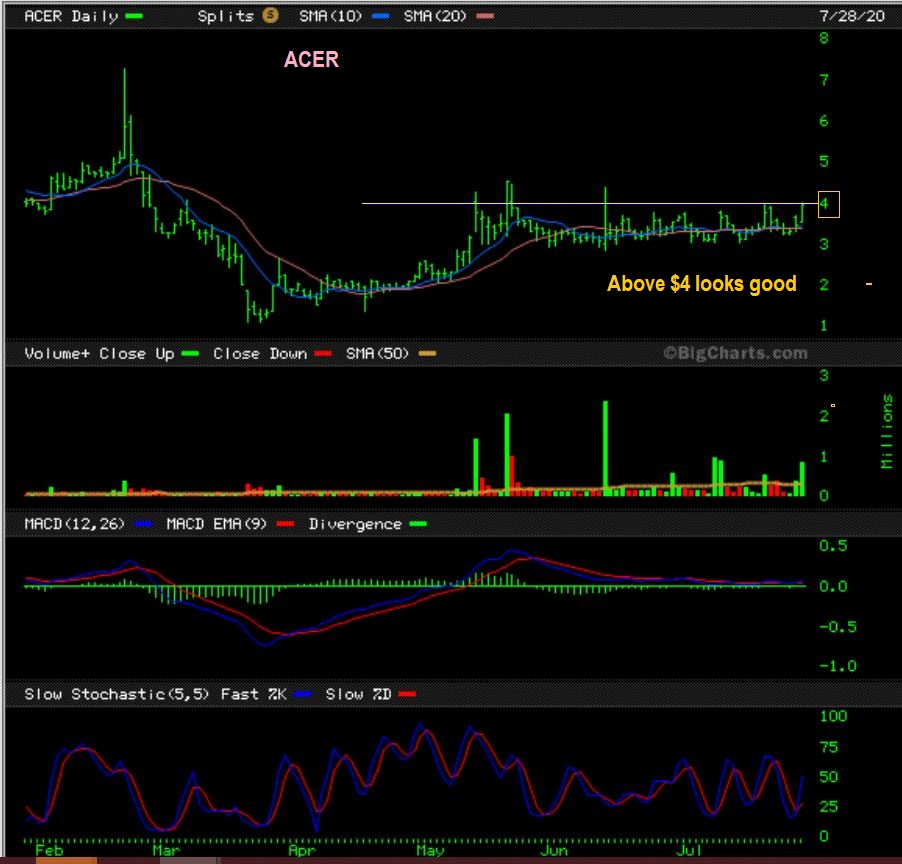ACER – This is not a company that I have mentioned in the reports, since we have been watching CHFS, NOVN, BNGO, etc , but I bought this one twice and it never broke out. Yesterday it ran to that $4 area again do I captured this chart. If it breaks and closes above $4 it could run back to Feb highs.