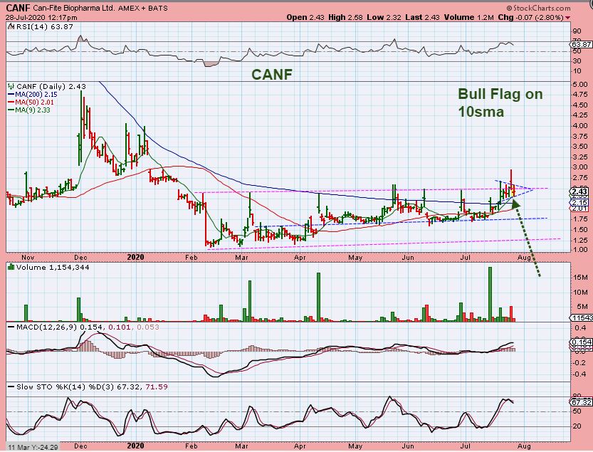 CANF  -I always knew CANF as an MJ Stock, but I saw the news clip below and it is applying to try one of its drug for phase II study in the treatment of Covid also.  So the chart does look progressive,  the news clip is below the chart.