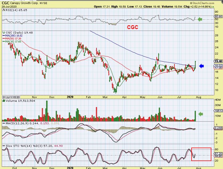 CGC  has strong volume and did push above its 200sma. It was pinched between the 50 & 200 and this type of set up looks good.