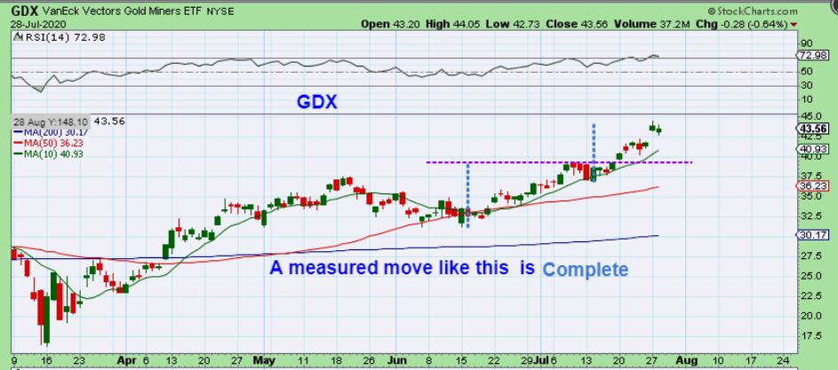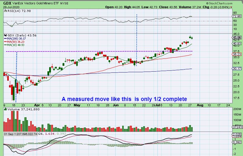 GDX #1 – This is not too extended.   You can do a longer term measured move & get higher price, but it might take a pull back and another daily cycle to start in order to reach that area ( and it may not even happen too).