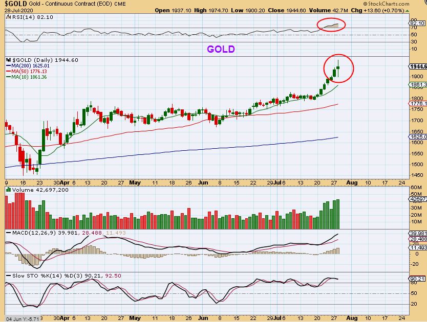 GOLD – This is a Giant Doji. The RSI is very high, the Doji is often indecision and can signal a change of direction after a long run.  We’ll see what the FED does to this. Honestly, it could go either way , but it is extended and as we discussed, the USD is due for a low.