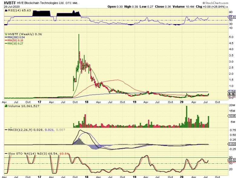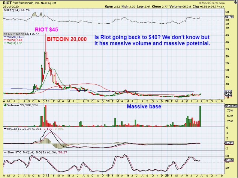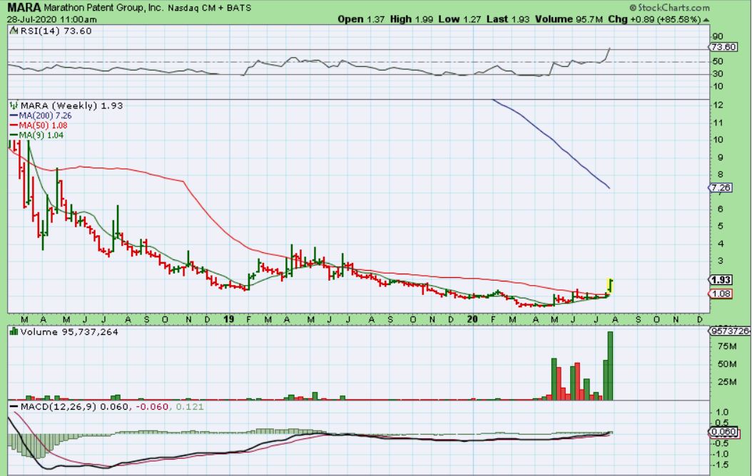 MARA WEEKLY BIG PIC – MARA was much higher in 2017-2018 ( $30plus).   We just saw MARA drop below $1 on a Public offering last week. Now it shot up to $2 ( 100% Move this week), but look at the upside potential! This might become a nice long term hold.