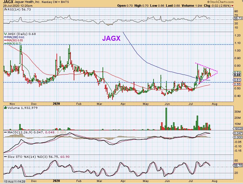 JAGX – I like the set up, but it is a bit jumpy at times.   This broke from a base & moved above the 50sma & then the 200sma on a quick 70% gain, and it has now started to put in a possible flag or triangle. I would expect this to break higher.  One concern would be if it dropped to tag that 200sma again first.  You might (TRADERS) want this on your watch list too.   It is in the 65 cents area and could run to $1.00.