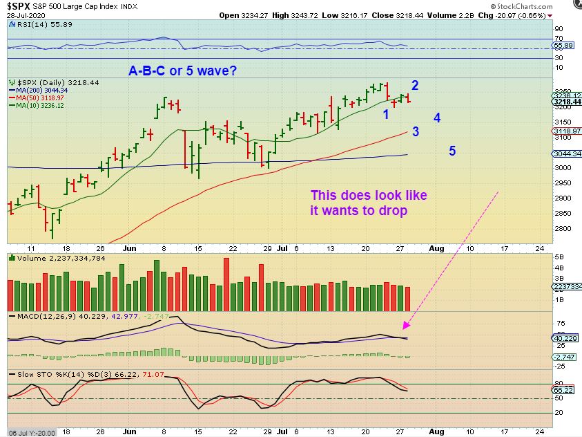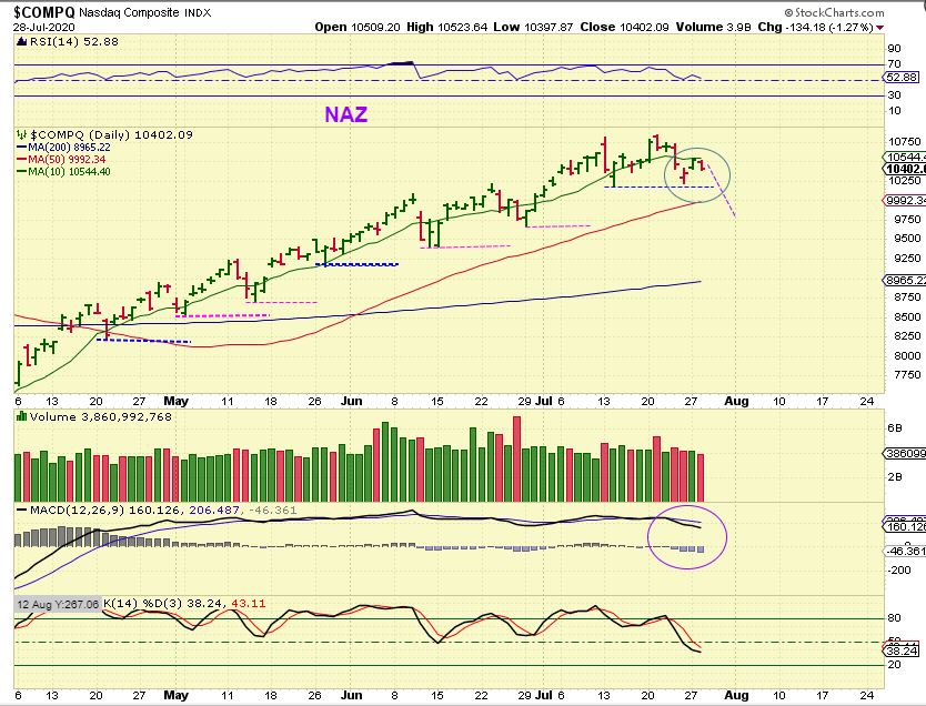 NASDAQ – I discussed that I am watching the series of higher lows in NASDAQ. If that changes and we see a prior low broken, we may be starting to roll over  ( a sign of weakness at least).  The NASDAQ could not get back above the 10sma.  CAN THE FOMC MTG HELP? Or will we start to see an  A-B-C Down? Or…