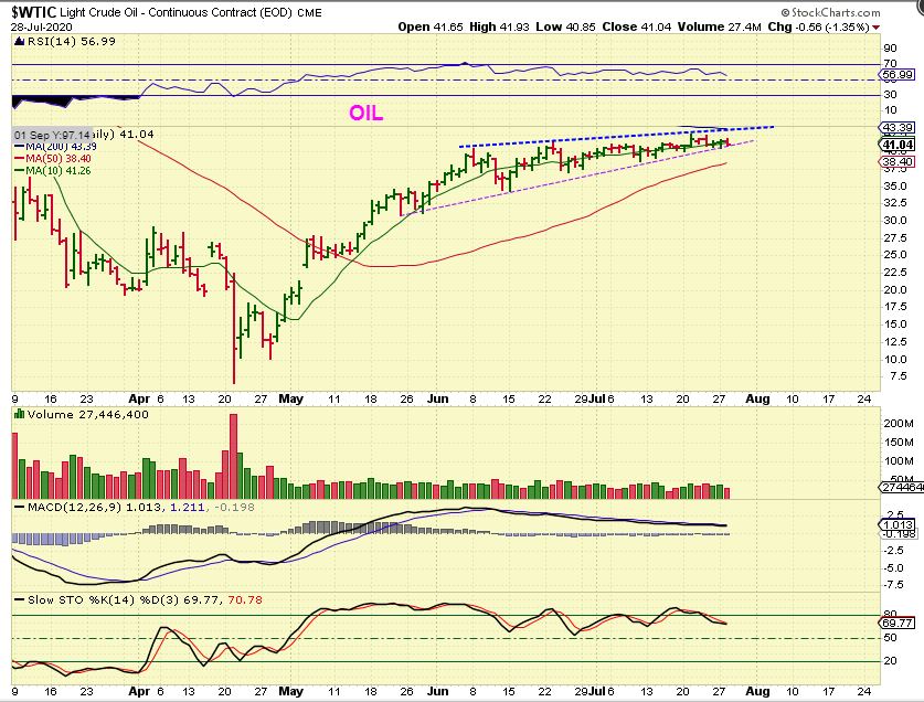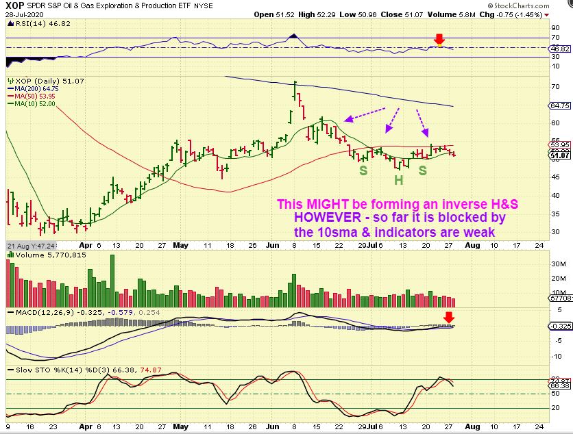 WTIC  – This has dragged on for a long time. Wednesdays are the Oil Inventory Report, and that might move Oil out of this tight consolidation.  Meanwhile the XOP has not been able to get back above the 10sma either…