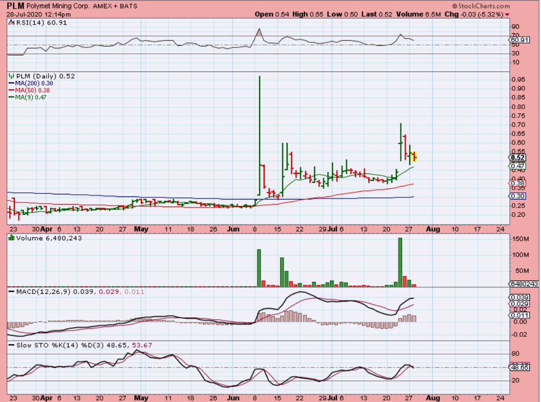 PLM – Also good for the watchlist, PLM Popped last week and has slowly drifted lower. It almost filled the gap and yesterdays volume was quite light. Look for a reversal .