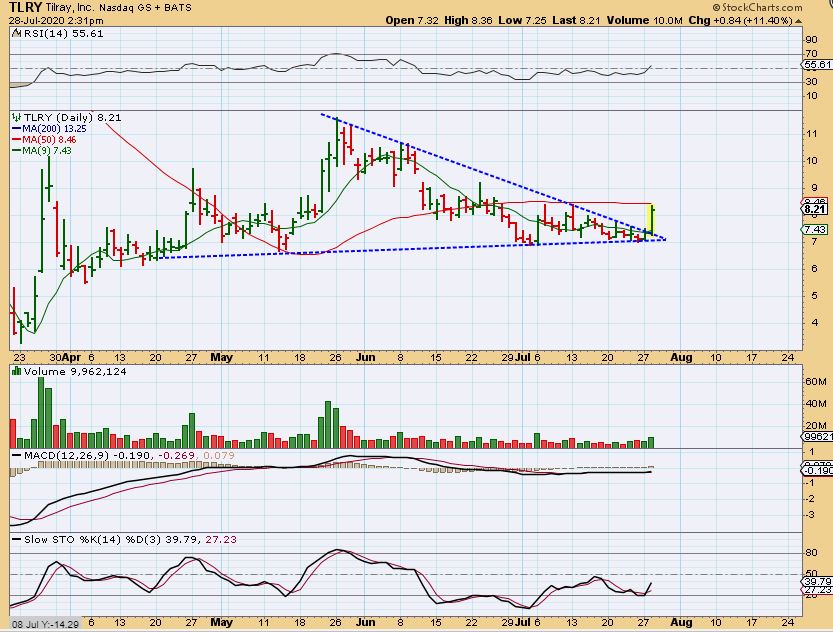 TLRY  – This was midday and TLRY looks ready to break out above the 50sma. If this runs to the May highs from here again, thats a nice trade. I bought this one.