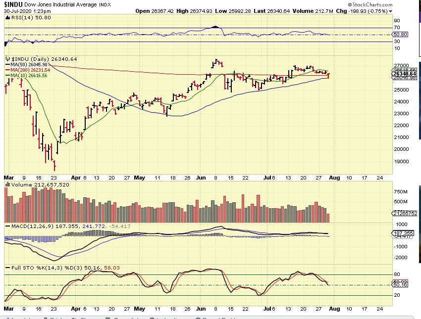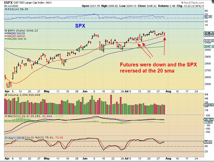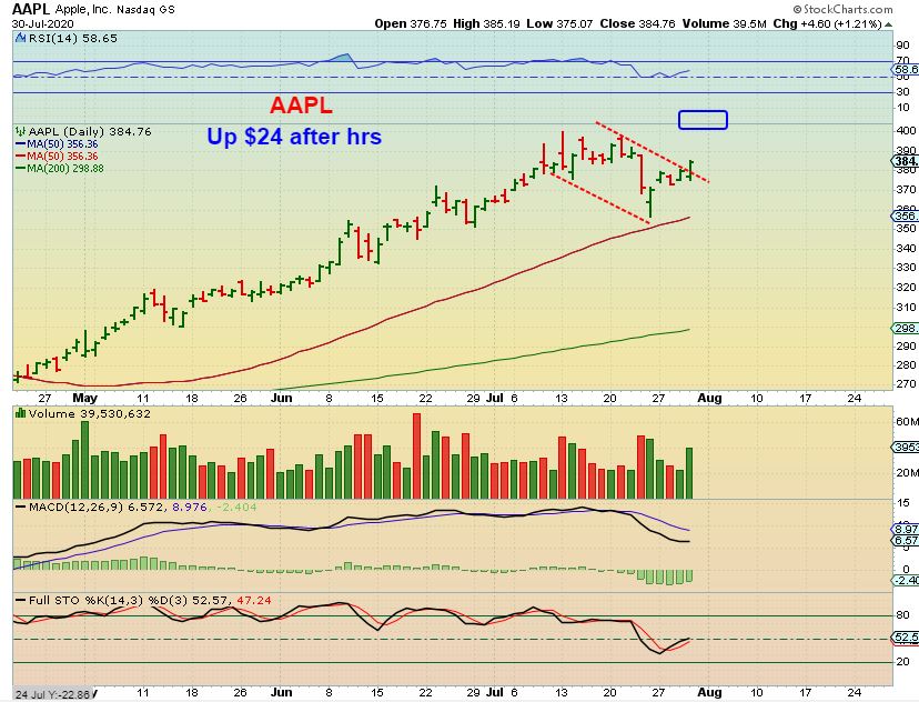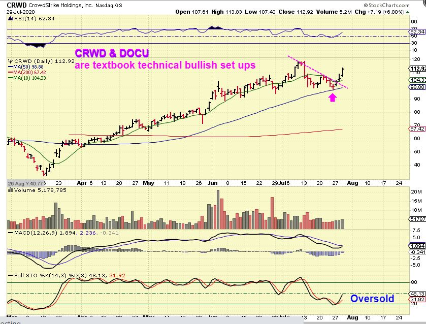 CRWD & DOCU – Yesterday I pointed out a couple of stocks that looked bullish after a small (normal) pull back. These can be bought with a stop trailing below it, and remember the charts of AAPL and AMZN in the report above. Those remain bullish and Covid has helped business in some cases ( Shop from home). AAPL is doing a 4:1 split, that can be bullish.