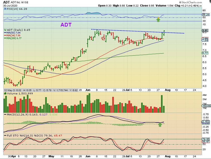 ADT – This is an inverse H&S with good volume coming in. It is a buy right here with a target over $10.50.