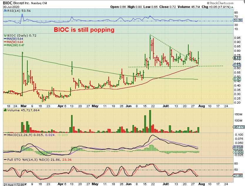 Bioc then ran to 95 cents and started to pull back, so some sold all or a partial to lock in gains and have been riding this chop for a month. On JULY 21 I called this reversal at the 34 sma a buy expecting a break out & rally. Did it?…