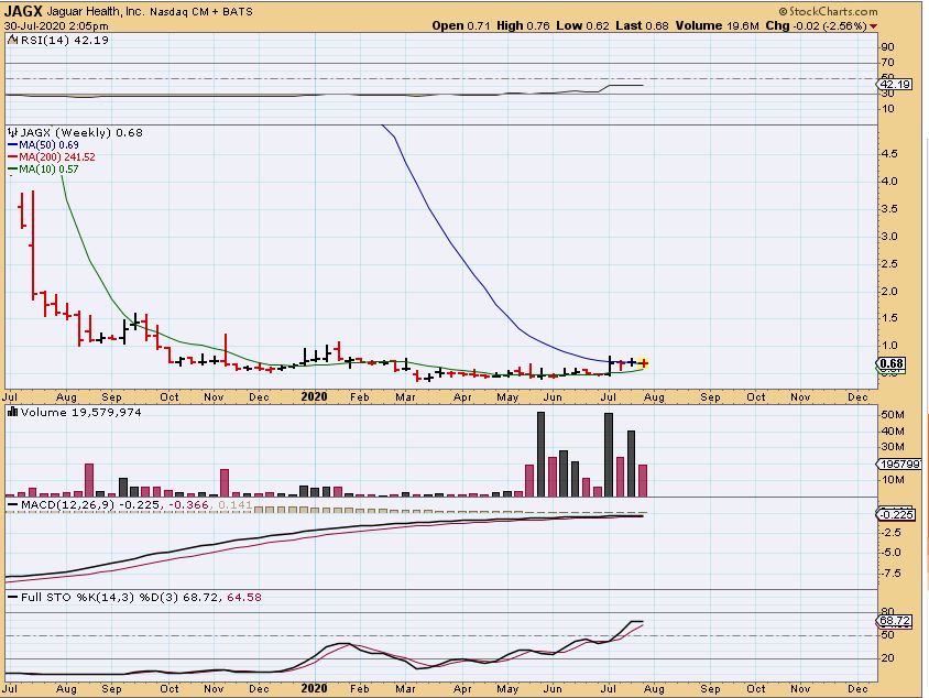 JAGX WEEKLY – I mentioned this as a long term chart that is Bullish. That is a very long base and it has what is called a ‘3 weeks tight’ pattern. The volume is pushing to the upside. I own this, but please know that it may not break outright away. These are longer term trades like CHFS, BNGO, BIOC, etc. The day to day action may vary.