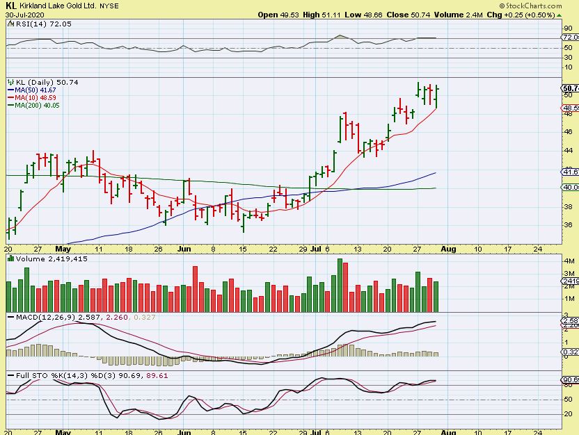 KL – As I have mentioned repeatedly in the reports, even with the drop in the GDX, GDXJ, and SILJ, some Miners can do their own thing. KL did drop, but it flipped off of the 10 sma and is already back near the highs.