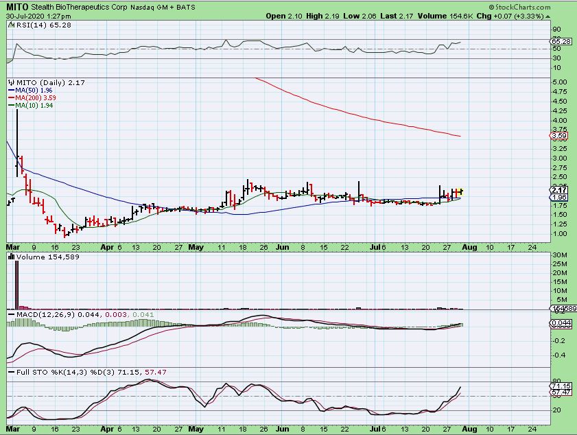 MITO DAILY – I have been watching MITO and it is also a good daily set up. I do not own this, but if it breaks higher with good volume, I may trade it for a few days or weeks. It is ore of a watch list ( Corona stock).