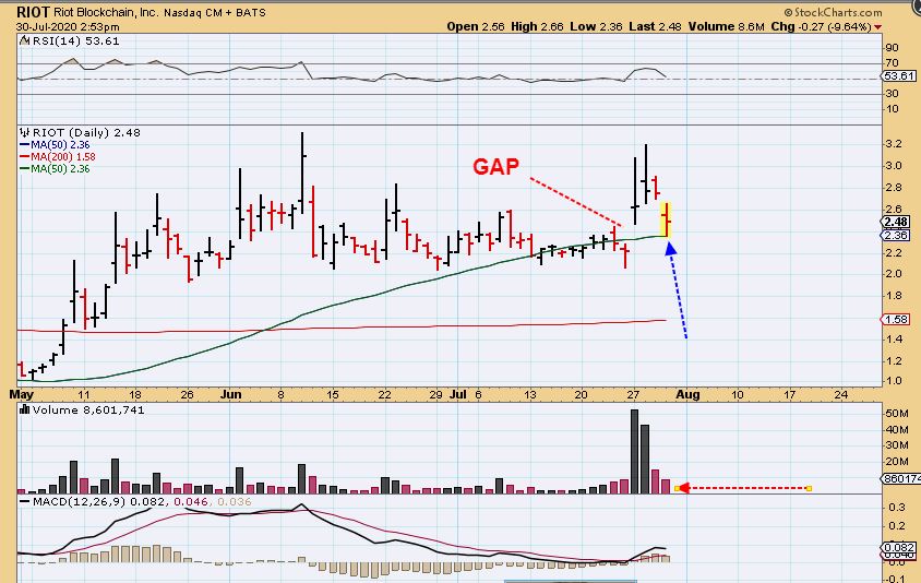 RIOT dropped sharply, but landed on the 50 sma & reversed. This was taken midday and it actually closed higher, so at this point, it is still a choppy price range wih good potetnial as Bitcoin moves higher (Above 10.000).