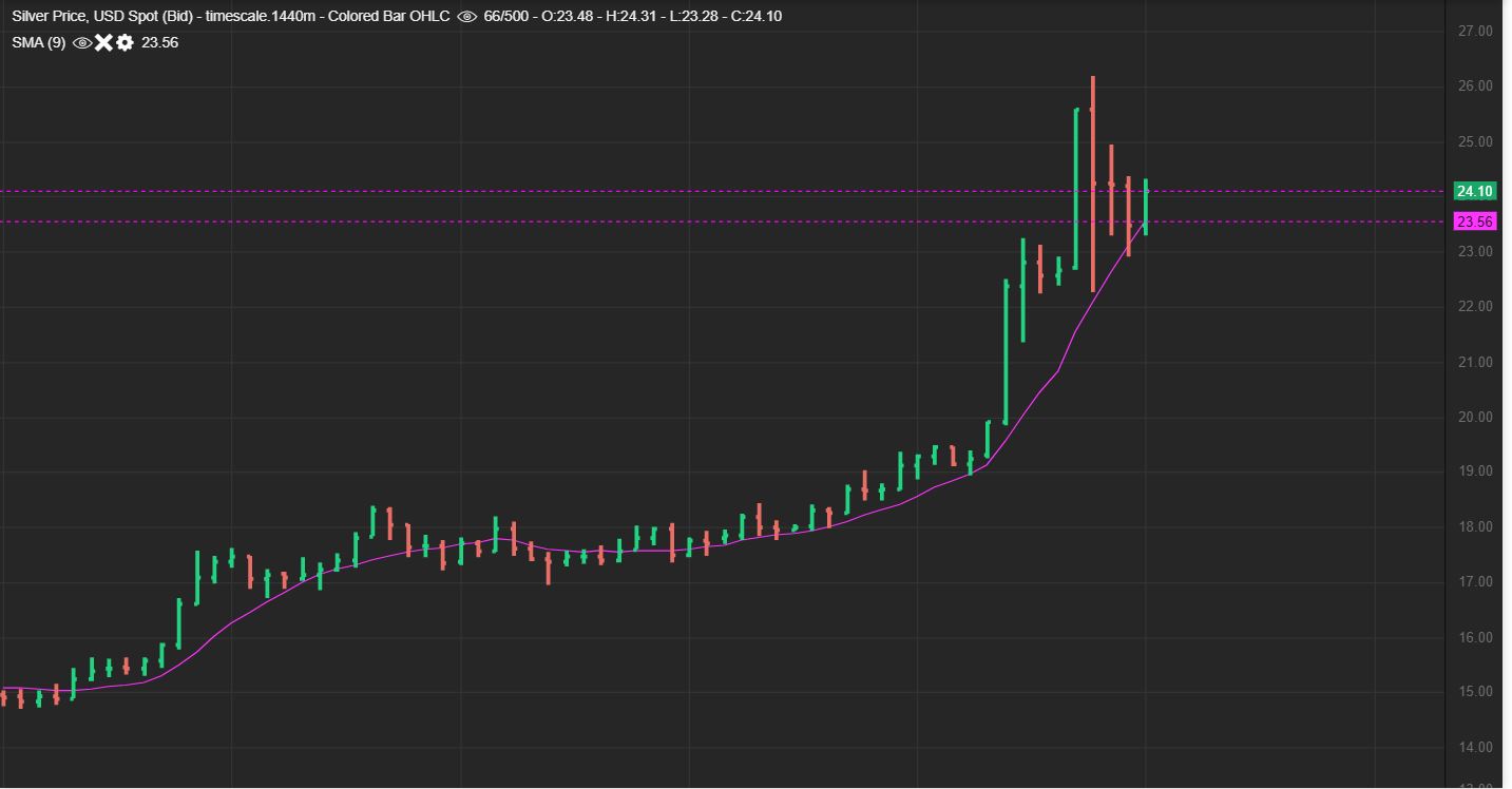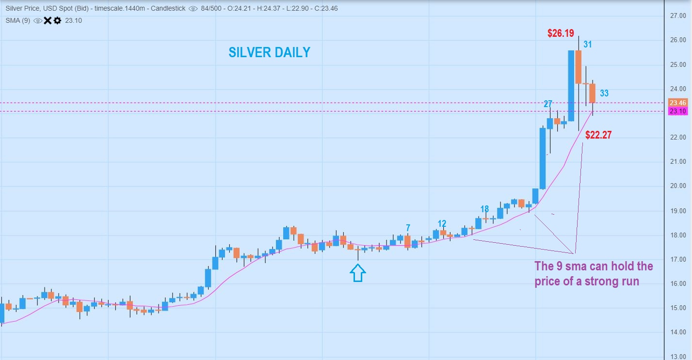 SILVER is a bit different, it did drop $4 from the $26.19 highs, but this also has held the 9 sma, and that is a strong move. Will it flag or form a pennant here? We’ll have to wait and see. Note: $26 was a target with resistance.