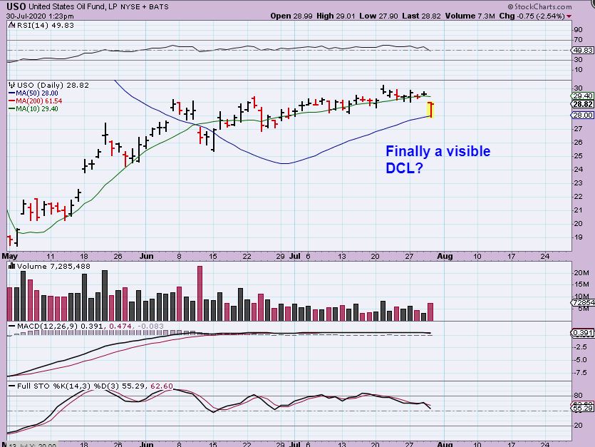 When I came back from lunch on Thursday I saw that the USO ( Oil Midday) had a sharp drop but bounced nicely off of the 50sma. COULD this be the visible version of a dcl for Oil?…