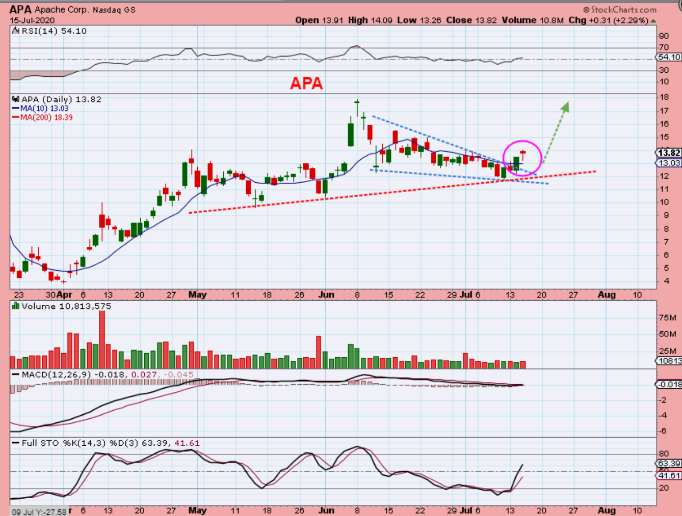 APA -I have been pointing out several Energy stocks that are now breaking out. I see OIL down in pre-market, so maybe they back test the break out? If so, add if they drop & reverse off of the support area. This now looks bullish and these can run & make great gains. This SMALL 4 day move is already $12 to $14. If it dips to $13, you can get $13 to $18+.