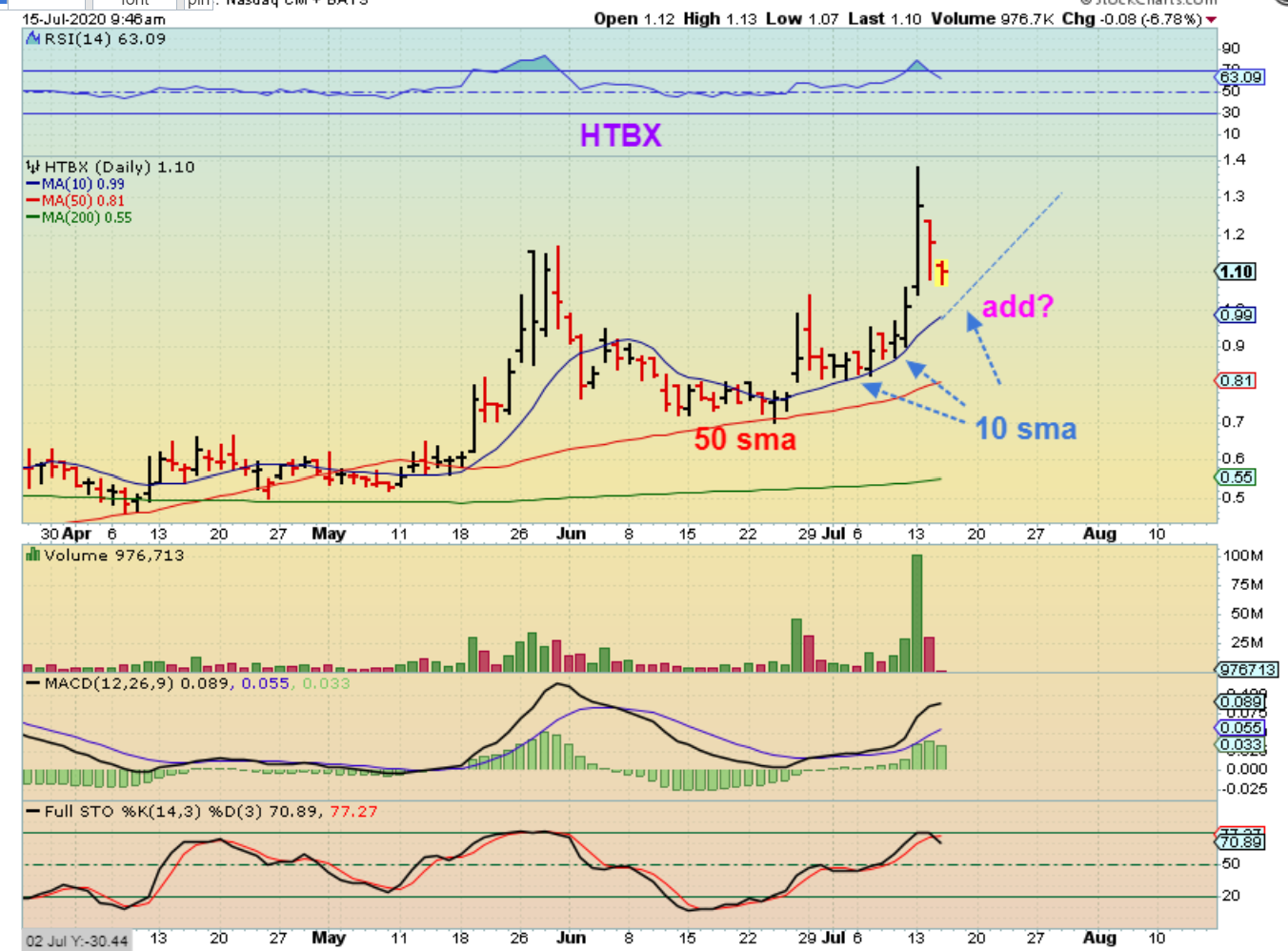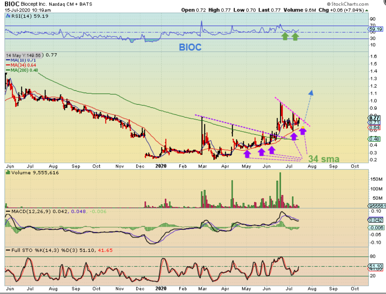BIOC has chopped into a possible bullish triangle. It has faithfully climbed the 34 sma since way back in May and it dropped there after the run to $1.00. Note: This is choppy, this is VERY HARD to ride out. This swings wildly:This actually dropped as the day went on and closed at 73 cents. A bargain 🙂 That said, this could break out & run 100% again to $1.40. I say that it is a buy if it drops to the 34 sma 1 more time or breaks out. THIS CHOP IS NOT FOR EVERYONE, KNOW WHO YOU ARE AS A TRADER.