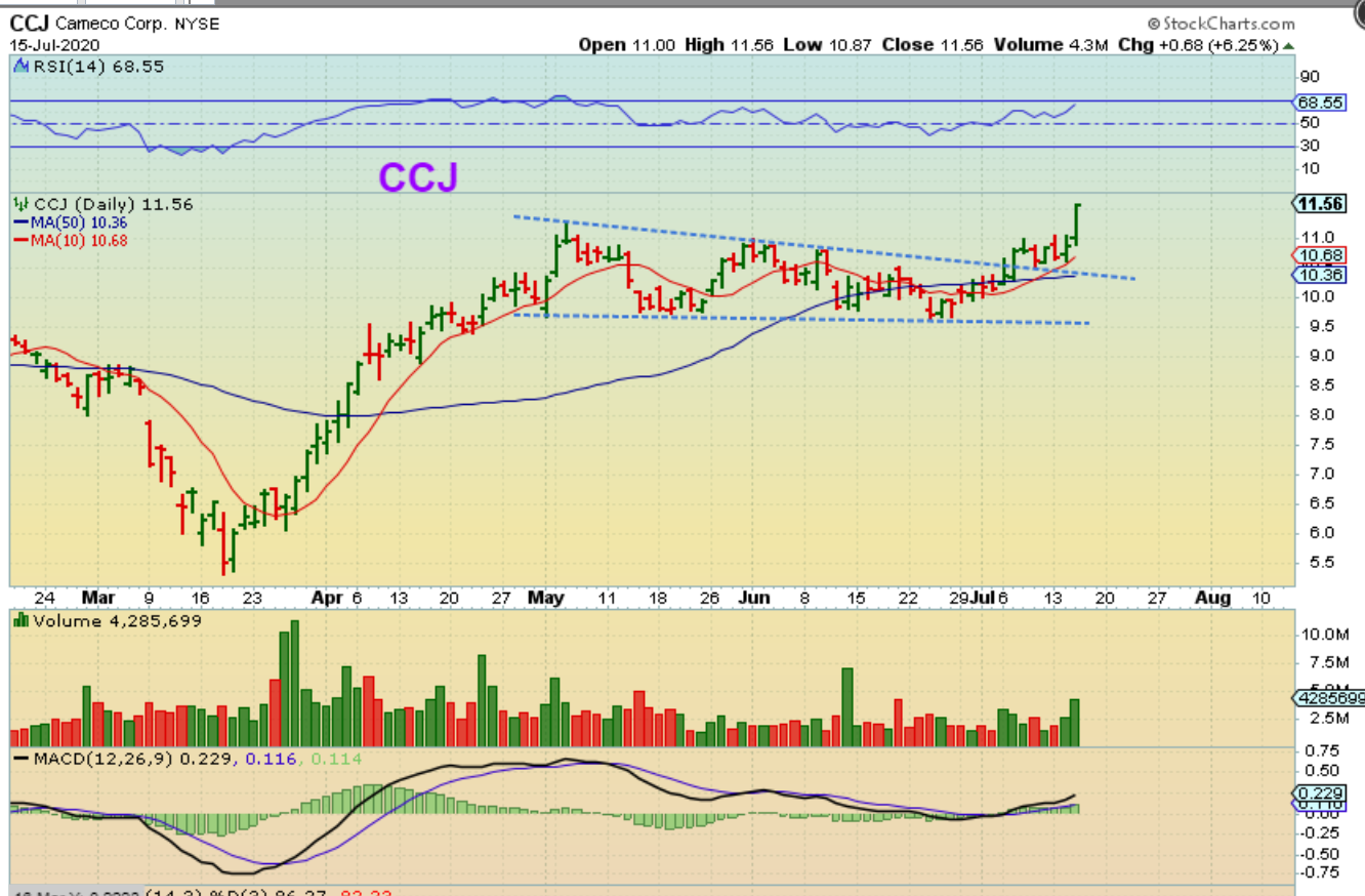 CCJ was a buy above the 50sma, and yesterday it gained another 6%. After a 2+ Month consolidation, these can run swiftly. Look at the March run day after day higher. Volume is bullish.