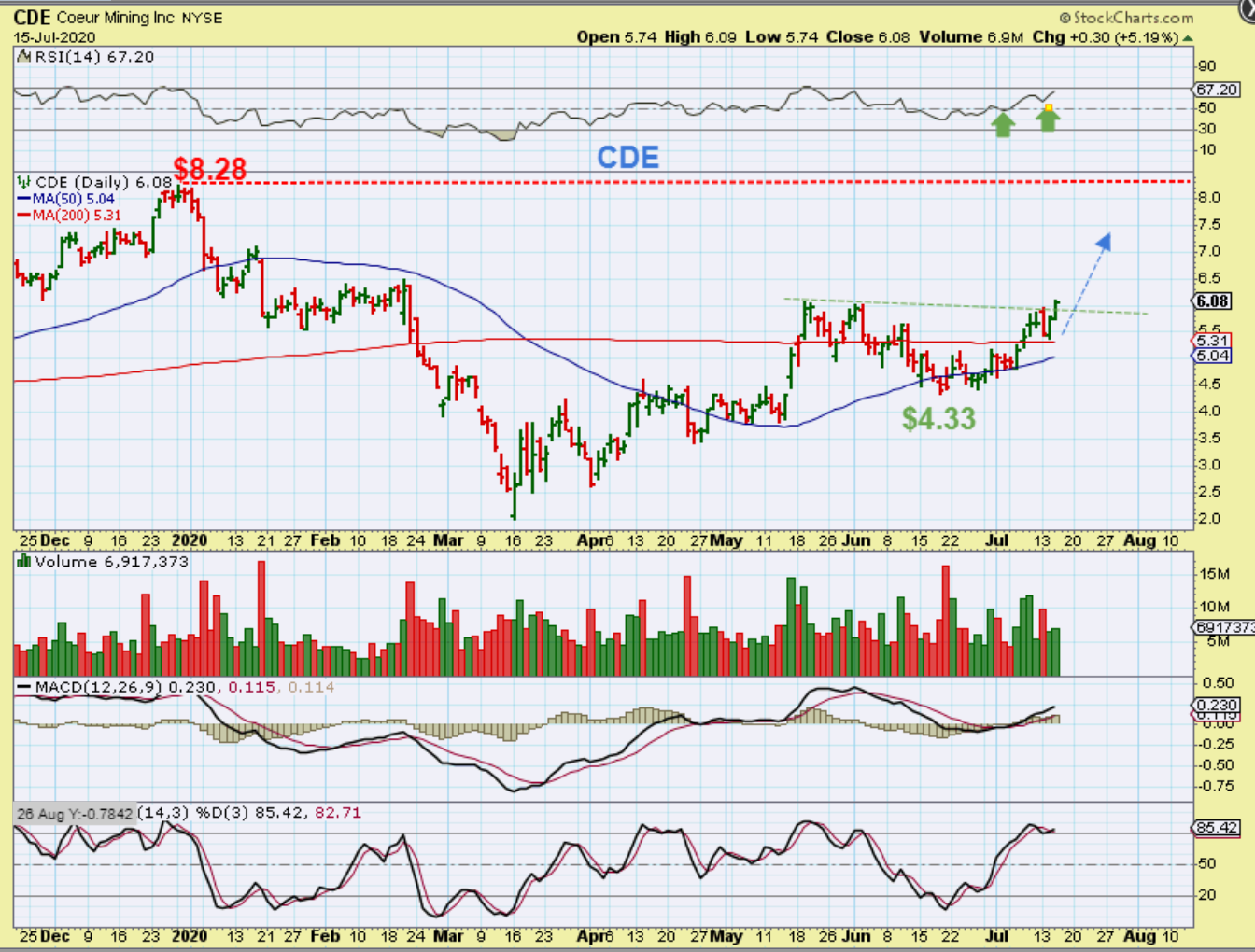 CDE broke above and back tested the 200sma recently. This was a buy in June at the 50sma & as it broke the down trend. CDE can run from that 44 point to $8+. See the chart.