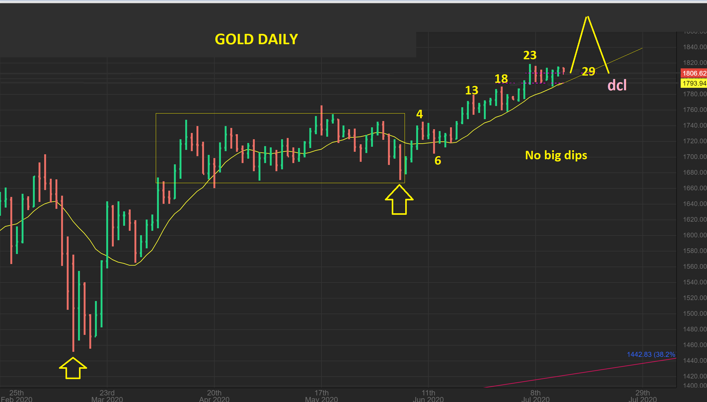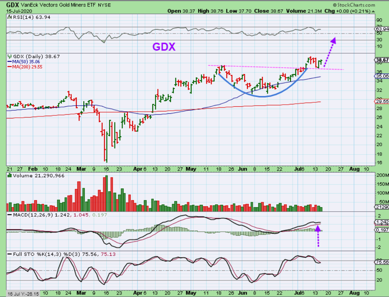 GDX formed a cup and has back tested it. This can be a high handle and a dcl may not even dip below that break out line, but instead form a slanted handle. Why? We are breaking from a bullish consolidation ( cup).