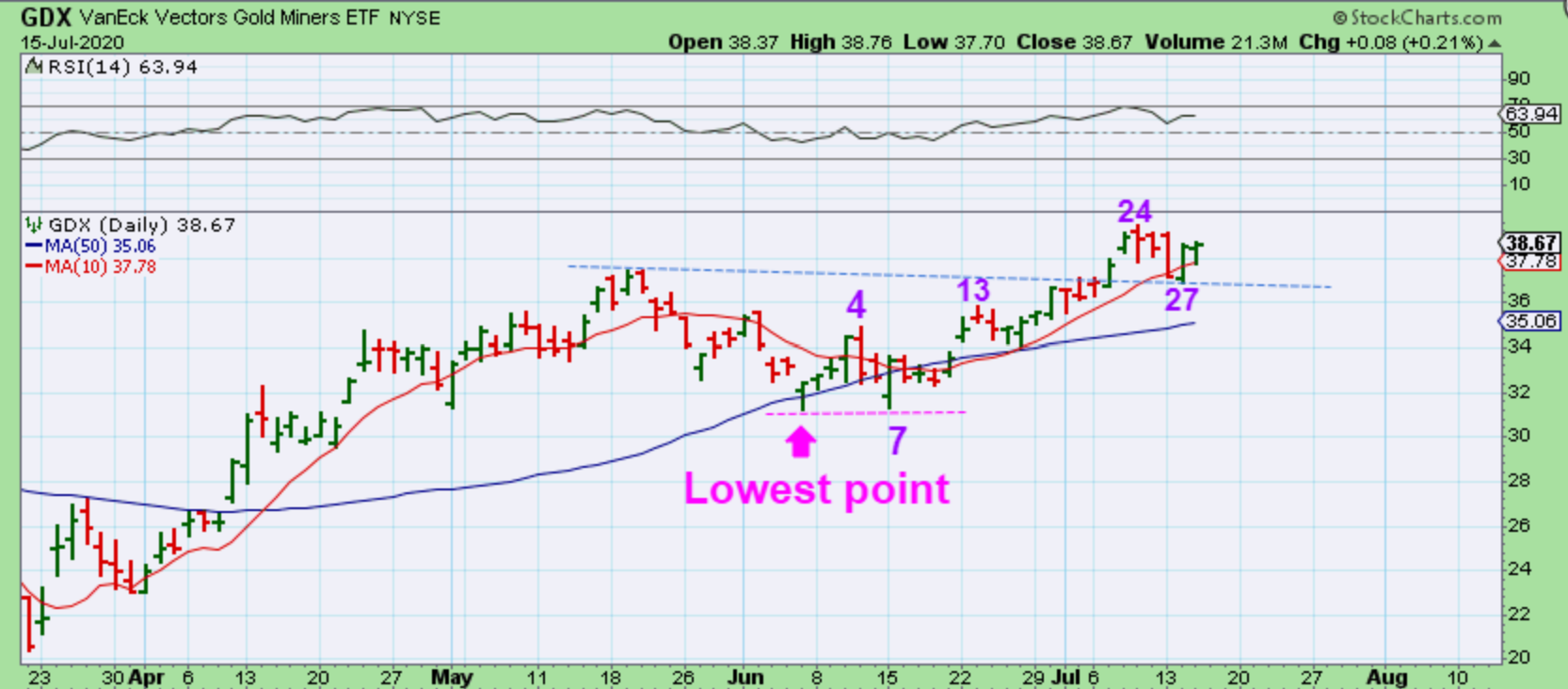 GDX – Zooming in we see a day 28 count off of the lows with 24 being the ‘peak’, and that is bullish ( R.T.). A handle could chop price & take this to roughly day 32ish low.