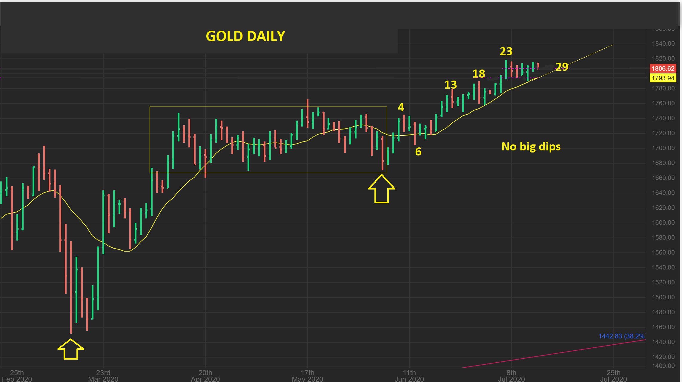 After our Box consolidation BUY at the dcl, Gold has continued to run higher. I would say that GOLD could still pop and drop ( to give a mild dcl), but we’ll just have to wait and see. It also could drop to back test the box as a DCL. A stop at the 10sma ( or 13 sma to allow a little movement) has kept bulls in the trade.