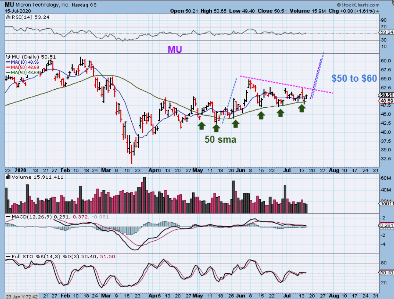 MU -I would be a bit more cautious with the Nasdaq forming that Bearish Engulfing Tuesday, but the semiconductor stocks AMD, MU, TSEM all still look bullish. I SEE RED FUTURES as I write Thursday morning, so if this drops to that 50 sma again, watch it for a reversal. If it breaks down, just keep it on a watch list. Tuesday it slightly broke the 50sma & recovered.