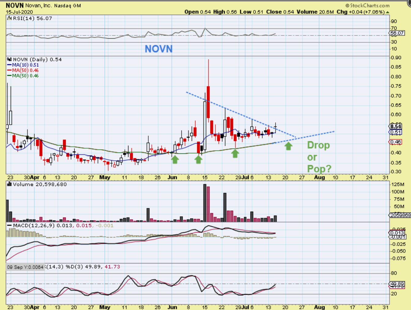NOVN is still choppy, but it kind of looks like it could break out sooner than later too. It CAN drop back to the 50 sma near 45 cents as a false break out here too, so be aware of that. The volume increased yesterday so this may be getting close to breaking out. That JUNE pop was a 100% move and I sold a bunch and have re-purchased down here.