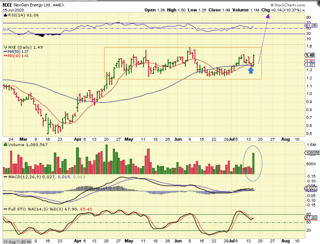 NXE – This is also a buy at the 50sma and it popped on strong volume. DNN is also ready to break a down trend line & Looks bullish, so this is a good looking sector.