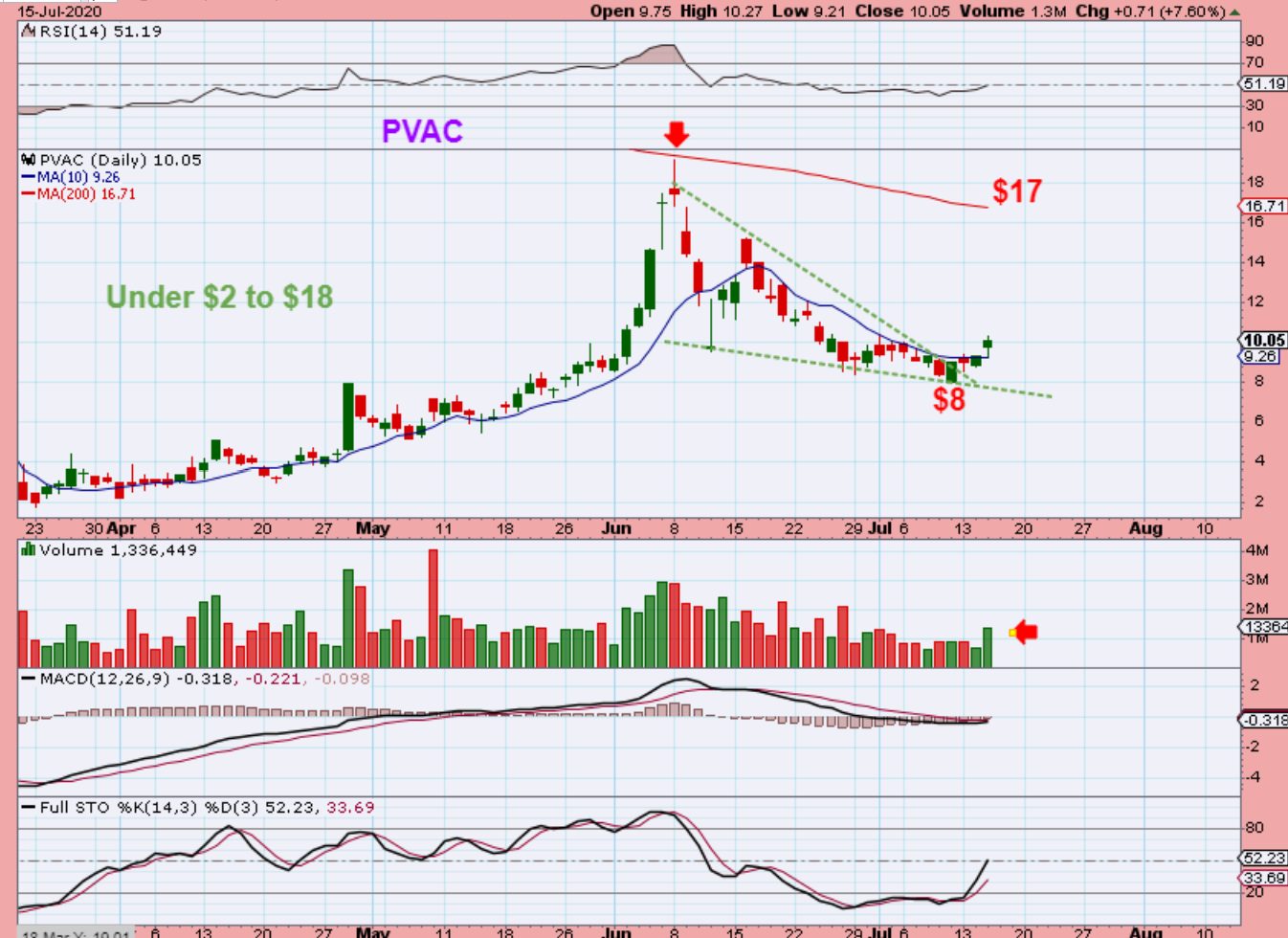 PVAC broke above the 10sma yesterday and it did an $8 to $10.27 move already, but this has much more upside if these get going. PVAC also has that 5 wave down look to it. I’d like to see 1-2-3-4-5 up. A tag of the 200sma again is almost 100% gains.
