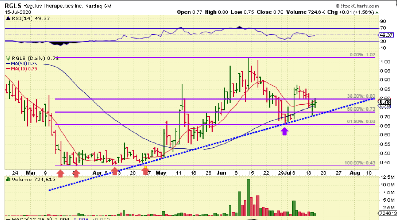 RGLS #3 : We already know that it popped to $1 in June and pulled back 6.18%. It is climbing a trend line, so it can either be bought here (with a stop) or buy the break out. I feel that there will be plenty of upside , even if you buy the break out of the down trend on the first chart that I put in this series of 3 charts.