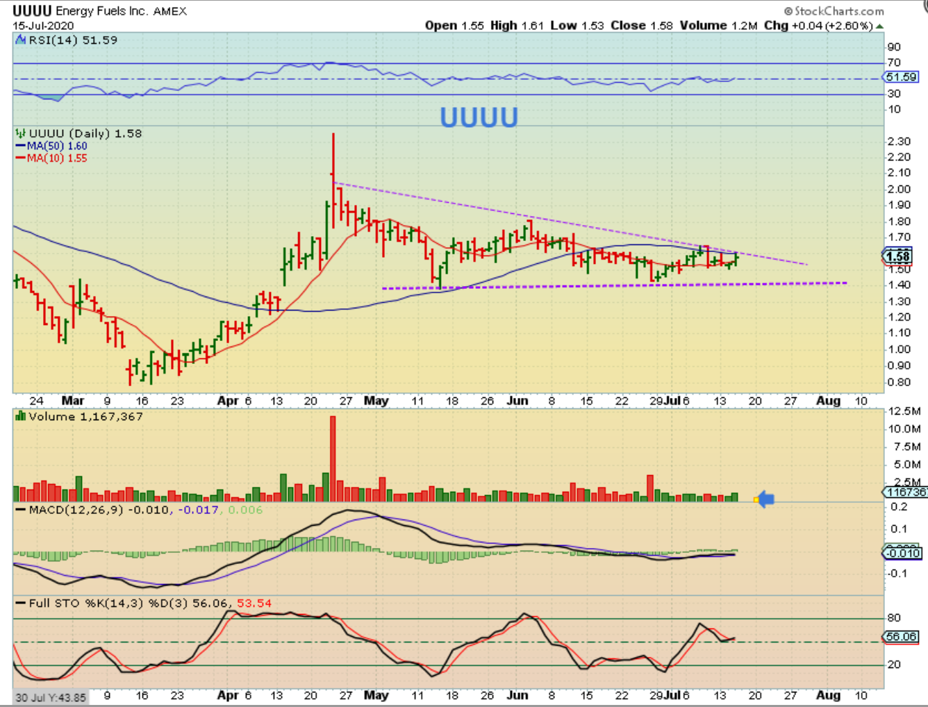 UUUU -Looking for a bullish set up that is still in the consolidation? UUUU was pointed out. This is a buy with a stop under the June lows. This looks ready to break out above the 50 sma Real Soon.
