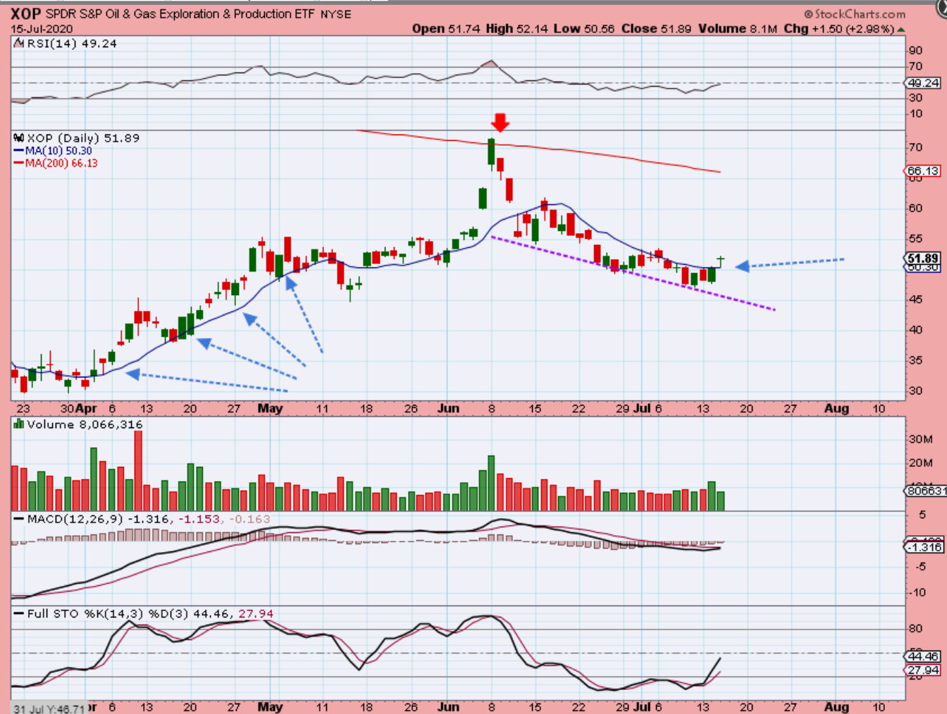 XOP -I’ve been watching Oil / Energy stocks for clues of a low ( I mentioned the 5 waves down looking complete) and the XOP DID pop over the 10sma. This usually signals a dcl is in place . I will point out a couple of Energy stocks that I have been mentioning in recent reports. They are ‘Buys’.