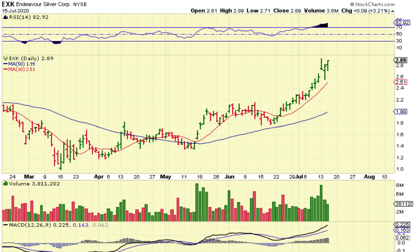 EXK & HL have been almost straight up over the last 2 weeks. The volume is impressive in EXK. EXK is up over 50% in the last 3 weeks. Very Nice! A stop at the 10sma kept us in the trade.