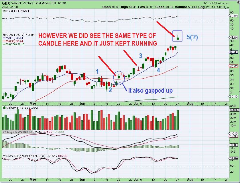 GDX –  I will say on the more ‘Bullish’ side that we HAVE seen this type of candle before, and it even gapped up & kept going in June, so if Gold runs higher, GDX will run higher.  NOTE:  GDX hit $44.46 , and…