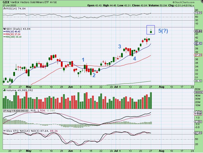 GDX – So this is often a type of ‘topping candle’ during a run too.  I could see it as a 1-2-3-4-5 wave move, but is it complete?  We don’t know, but many things are kind of lining up here…