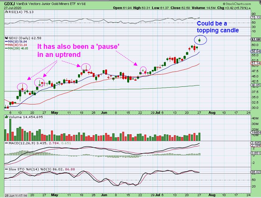 GDXJ  actually hit $64 in after hrs, but during regular hours it tagged $63.31 before reversing a bit lower.   It also had that reversal top type of candle, but we’ve seen it in past runs and it caused a pause. Tuesday will let us know if the run is finishing up at resistance or if there is more gas in the tank.