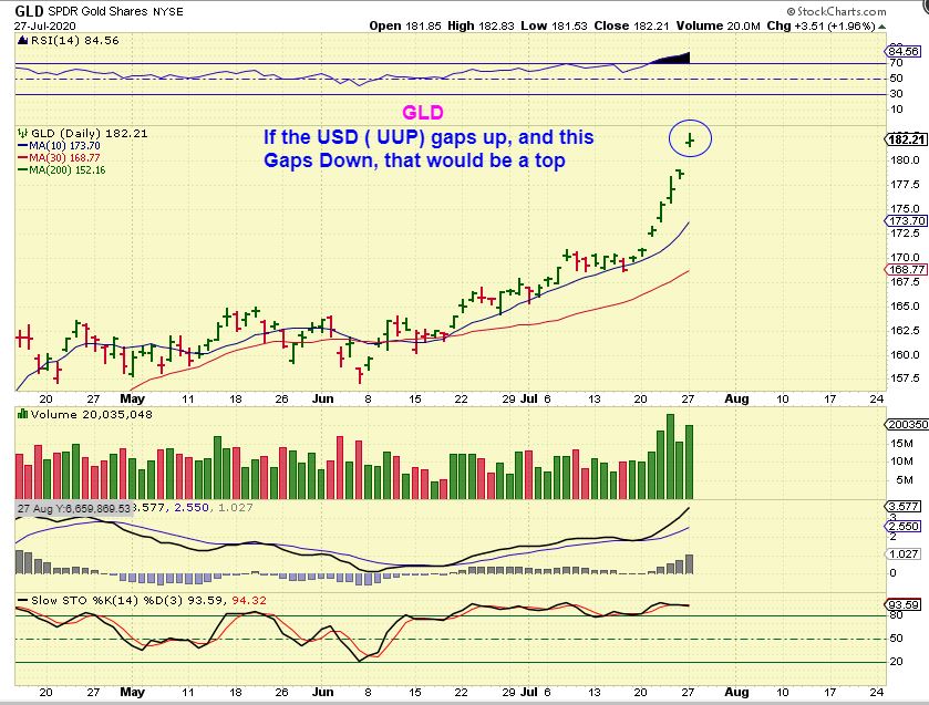 GLD  is doing a runaway move that also gapped higher Monday. That can be very bullish until I saw that gap open with the UUP gap down.   On Monday as I write, GOLD is hitting all time highs,  so THE SKY IS THE LIMIT.  We really don’t have a solid upside target price ( though I do have a few guesses).   A GAP DOWN MONDAY could be a topping candle.  There is more too…