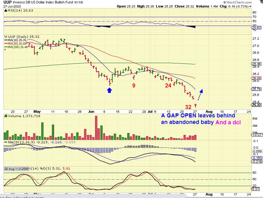 UUP- I saw the UUP gap down and just sit there all day.  GLD gapped up and sat there all day. IF these were to gap back in the opposite direction, you would have an abandoned baby in place here.  That would also be a day 32 DCL, so it seemed very likely ( until I saw GOLD & SILVER IN AFTER HRS) .  🙂