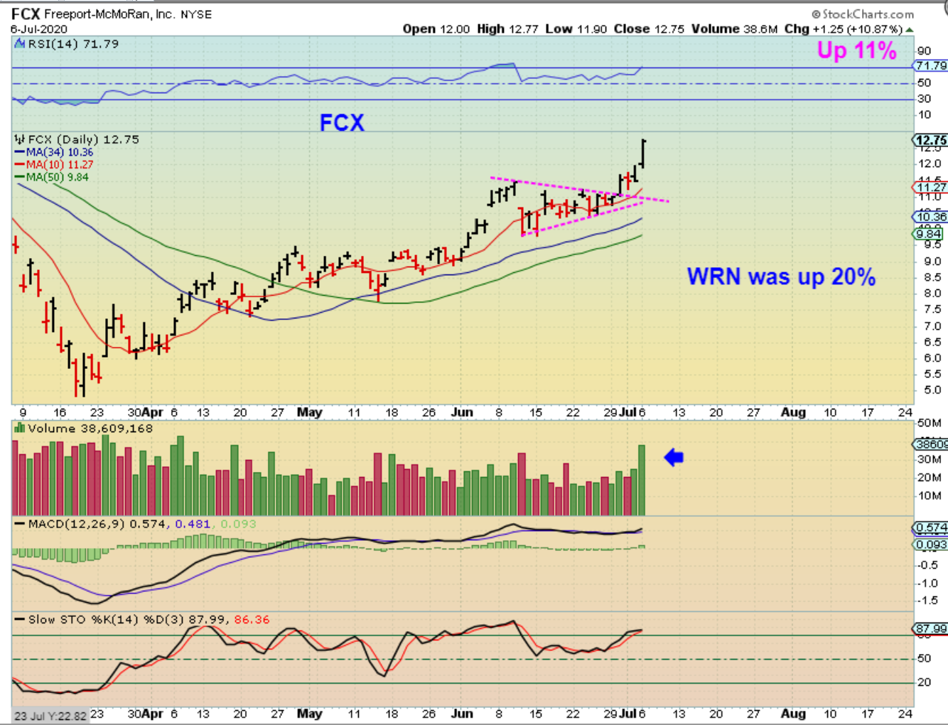 FCX – broke out since then and was up another 11% Monday.