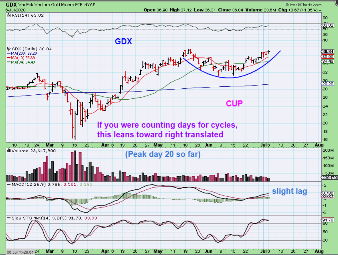 GDX has formed a cup too . This is a new peak and we are 20 days from the lowest low in that cup. That makes Miners look Right Translated.