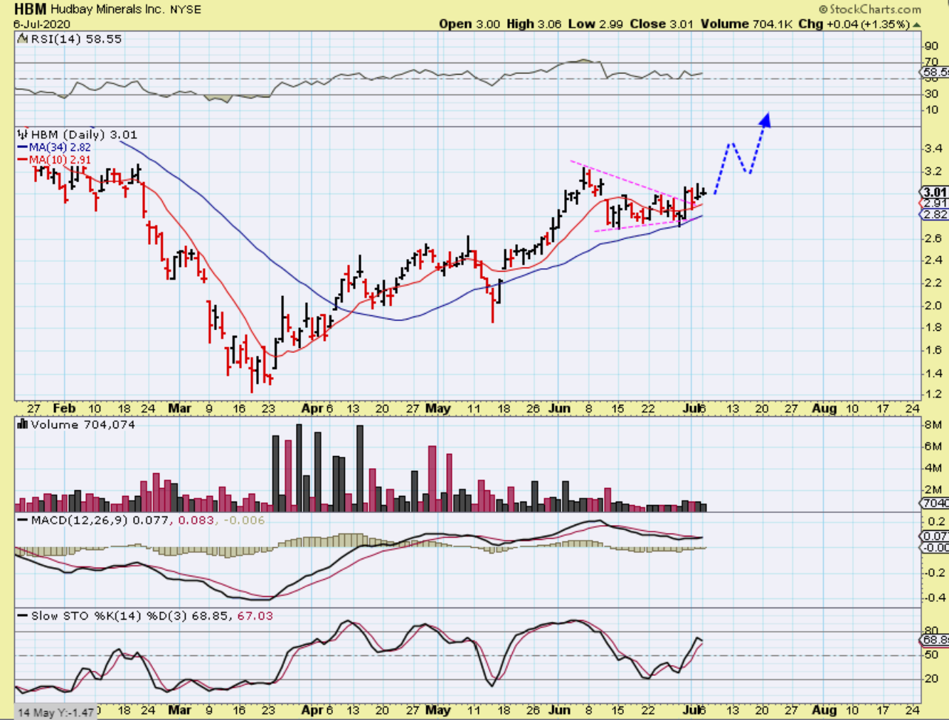 HBM is a break out from a triangle too. This can be bought for a short trade or even a longer term trade. They are a bit of a rough ride at times, they’ve been choppy, but are in an uptrend since March.