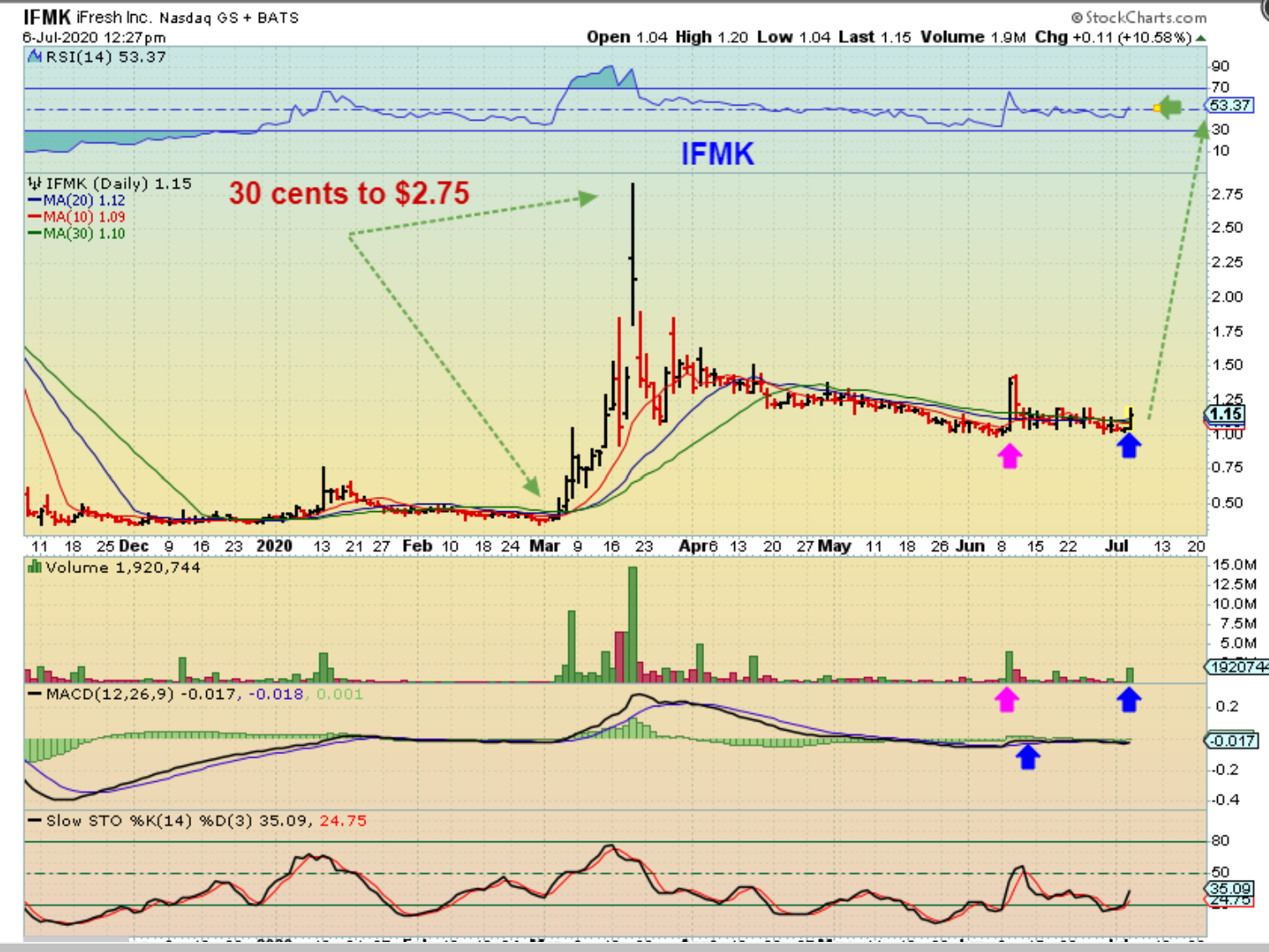 IFMK – They deliver groceries and are benefiting from the Covid Virus, since the elderly and others may prefer to just stay home. This has big upside potential, and I bought it around $1.10-$1.13 & Grabbed this chart. Unfortunately it moved up a lot higher as I drew this up and into the close ( Its at $1.28 as of the close). If it pulls back, It could be a good buy. The last POP pulled back, so this goes on a watch list for many trades. I own it, so I’ll keep an eye on it.