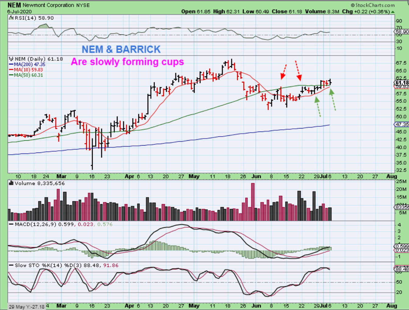 NEM – I wanted to take a look at NEM & Barrick and they are slowly progressing , not not really showing a great sign of strength. NEM pushed above the 50sma on the 3rd try, and notice how it rides the red 10 sma. That may make a reliable ‘stop’ for those concerned about giving gains back on a pull back.