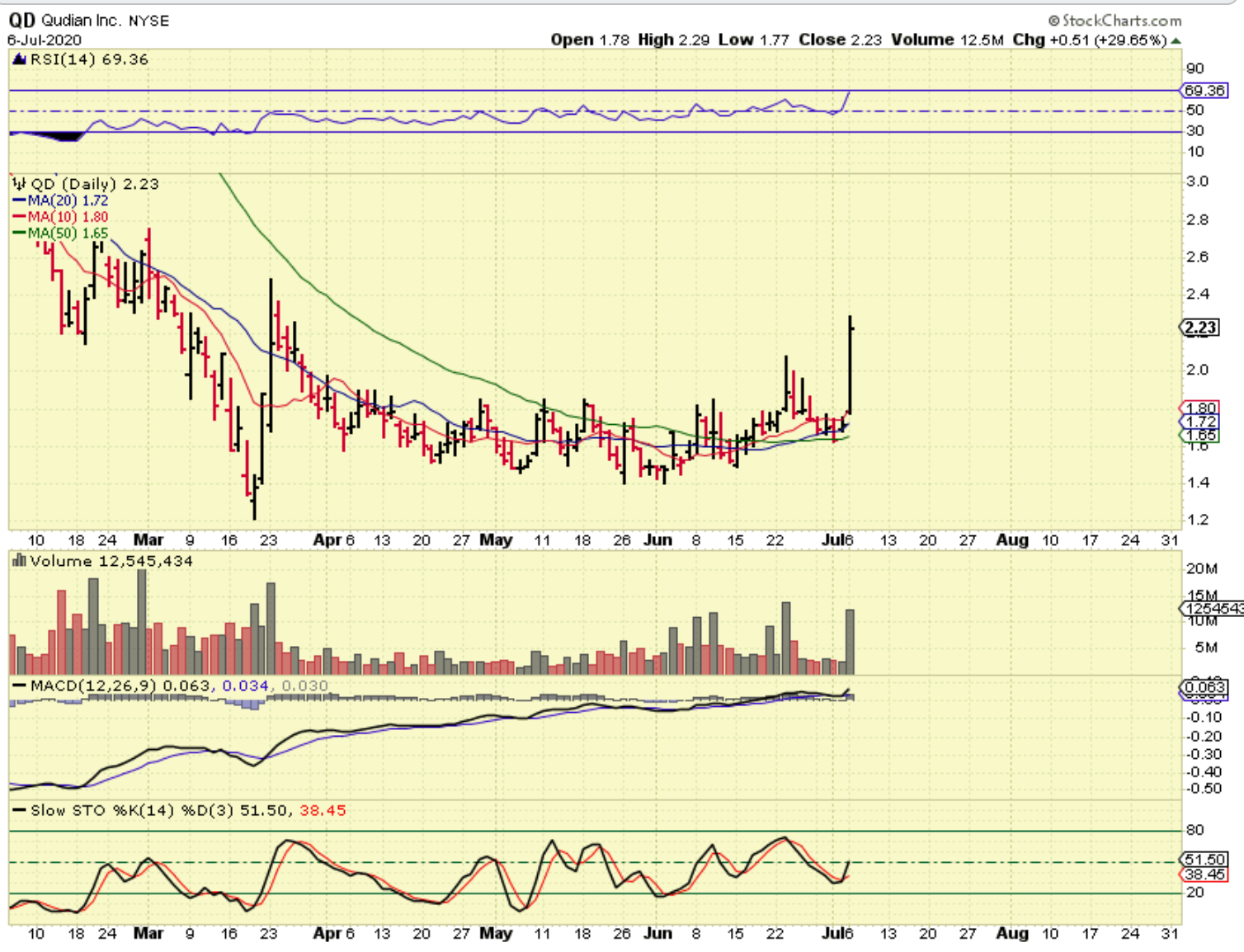QD after retesting that 50 sma, QD popped 30 % Monday. Volume has been strong on the pops and QD will probably continue trending higher out of this base. It is oversold.