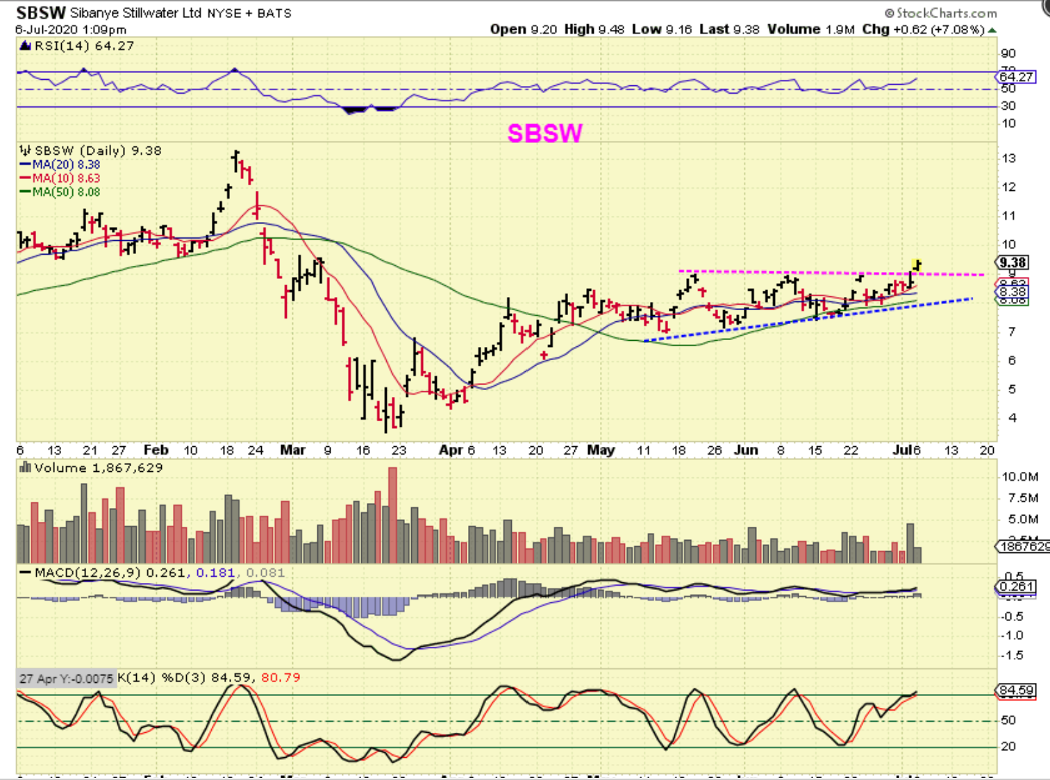 SBSW broke out and I captured this chart midday. It went on to close up over 9% and looks like a good break out for a run to the February highs. You could buy this or see if it back tests the break out too.