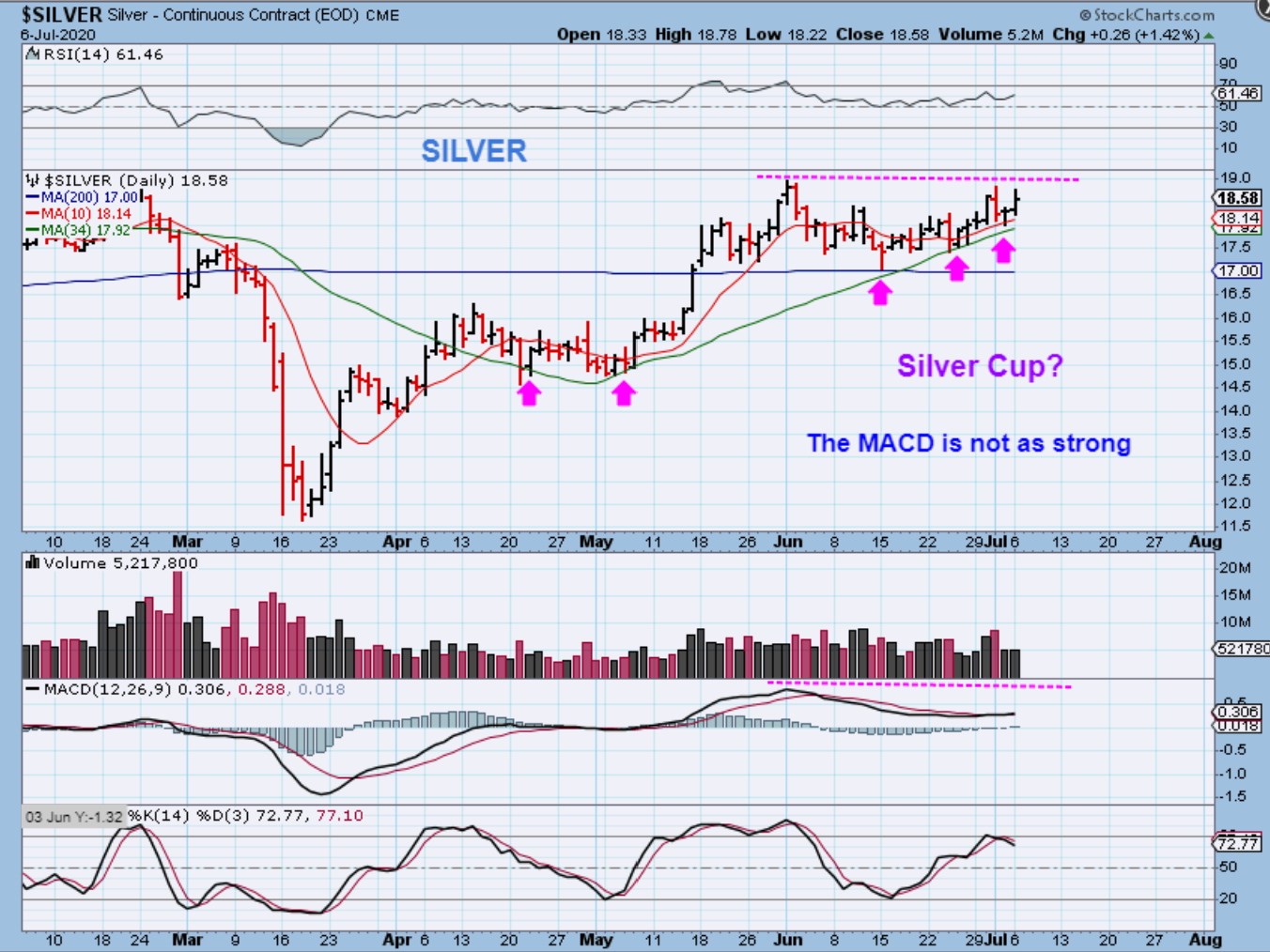 SILVER looks to have formed a cup, and has nicely been riding that 34 sma ( use as a stop?). The MACD seems to be a bit weak.