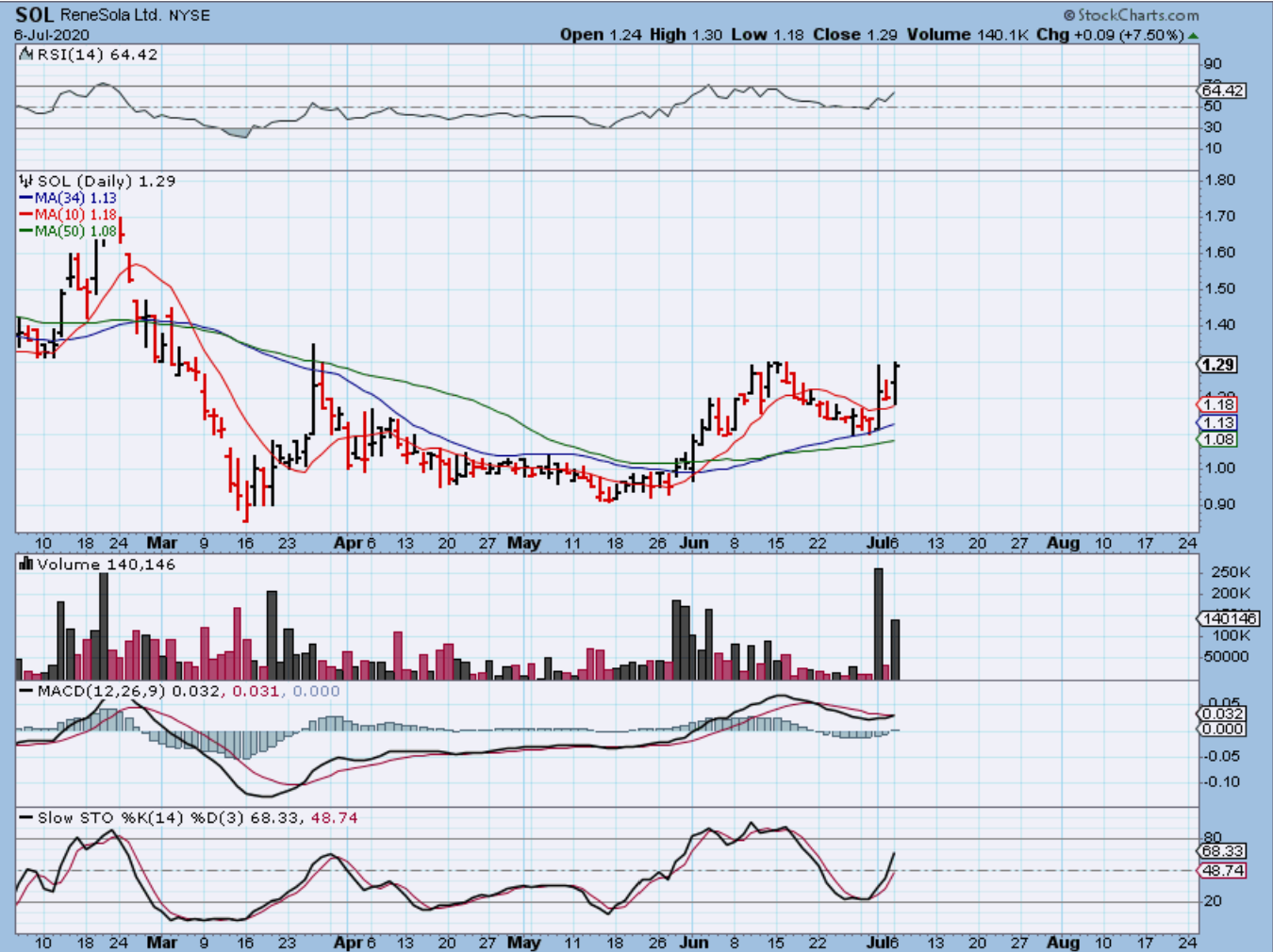 SOL had a possible target of around $1.50 or more (red arrow). I really liked the set up of JKS, SPWR, and CSIQ too. I bought SOL for this trade off of the 34 sma.